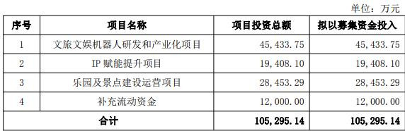 本次发行股票募集资金总额不超过105,295.14万元(含本数),在扣除相关发行费用后计划全部投资于文旅文娱机器人研发和产业化项目、IP赋能提升项目、乐园及景点建设运营项目、补充流动资金。