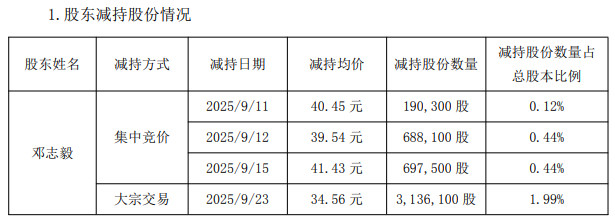 近日,公司收到邓志毅出具的告知函,获悉其于2025年9月15日至2025年9月23日期间通过集中竞价、大宗交易方式累计减持公司股份3,833,600股,占公司总股本的2.43%,权益变动触及1%整数倍。截至公告披露日,邓志毅的股份减持计划已实施完毕。