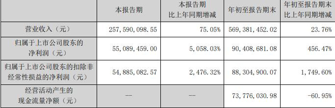 年初至报告期末,公司实现营业收入5.69亿元,同比增长23.76%;归属于上市公司股东的净利润9040.87万元,同比增长456.47%;归属于上市公司股东的扣除非经常性损益的净利润为8830.49万元,同比增长1749.60%;经营活动产生的现金流量净额7377.60万元。